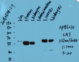 | Target/Specificity | This CAT antibody is generated from rabbits immunized with a KLH conjugated synthetic peptide between 152-180 amino acids from the Central region of human CAT. |